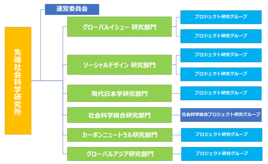 先端社会科学研究所は、社会科学総合学術院に設置され、研究所に関わる事項を議決する組織として運営委員会を置き、「グローバルイシュー」「ソーシャルデザイン」「現代日本学」「社会科学総合」「カーボンニュートラル」「グローバルアジア」の6つの研究部門を置く。各部門の下には、先端社会科学研究所の構成員である兼任研究所員がプロジェクト研究グループを組織する。
