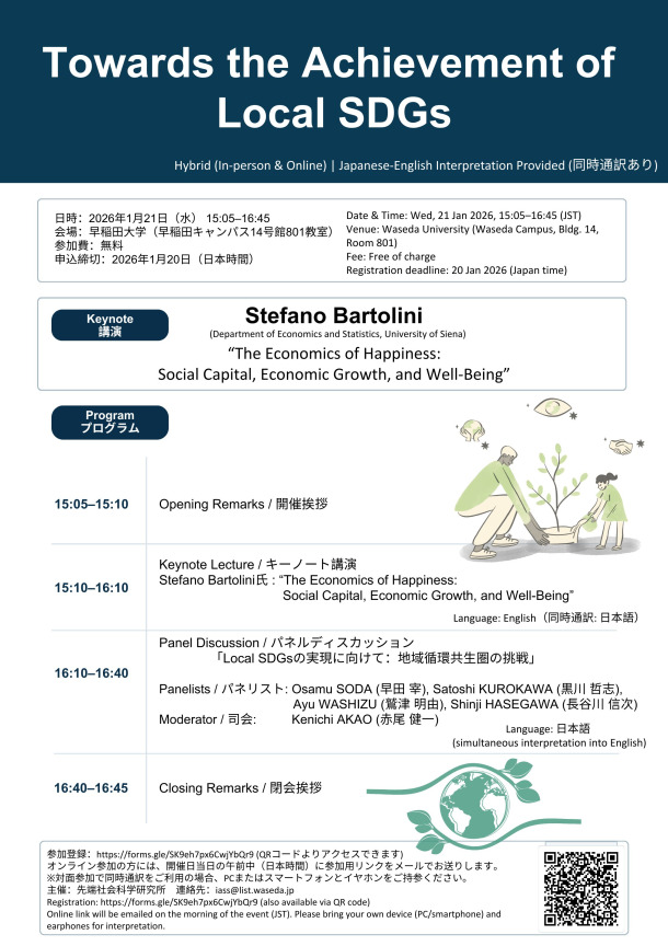 本シンポジウムでは、Stefano Bartolini 氏による講演を軸に、ウェルビーイング、社会関係資本、経済成長(GDP)と持続可能な発展の関係について幅広く議論します。個人やコミュニティにおけるつながり・信頼と主観的幸福との関連、およびポストGDPの観点からの社会評価のあり方を概観しつつ、ローカルSDGsを念頭においた地域レベルでの実践や政策への含意にも触れる予定です。