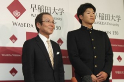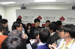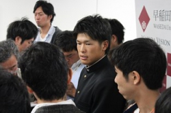 11月10日、早稲田大学にて「2014年プロ野球ドラフト指名選手 千葉ロッテマリーンズ指名挨拶・記者会見」が行われました。中村奨吾選手(スポーツ科学部4年=天理高校)は、千葉ロッテマリーンズ関係者からの指名挨拶を受け、岡村猛野球部監督とともに会見を行いました。