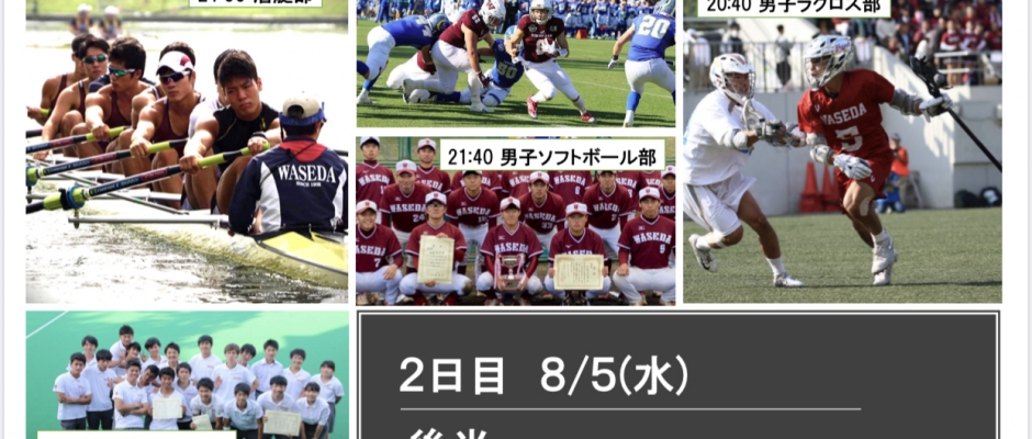「早稲田大学体育各部有志オンライン新歓@waseda1shinkan」による、2020年度4回目のオンラインによる新歓合同説明会。2日目の8月5日(水)は前後半に分けて実施。後半は男子ラクロス部・男女漕艇部(ボート)・米 … 続きを読む Zoom新歓8/5 21:00〜 男子ラクロス・男女漕艇(ボート)・米式蹴球(アメフト)・男子ソフト・男子ホッケー