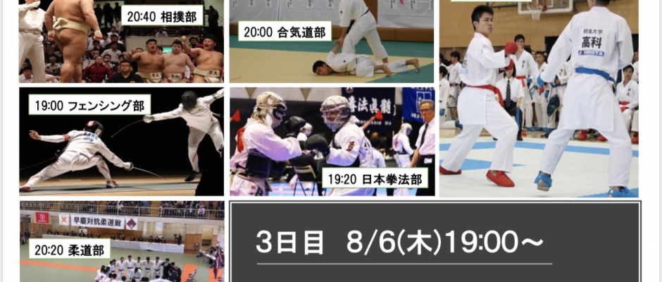 「早稲田大学体育各部有志オンライン新歓@waseda1shinkan」による、2020年度4回目のオンラインによる新歓合同説明会。3日目の8月6日(木)はフェンシング部・日本拳法部・空手部・合気道部・柔道部・相撲部の5部 … 続きを読む Zoom新歓8/6 19:00〜 フェンシング・日本拳法・空手・合気道・柔道・相撲