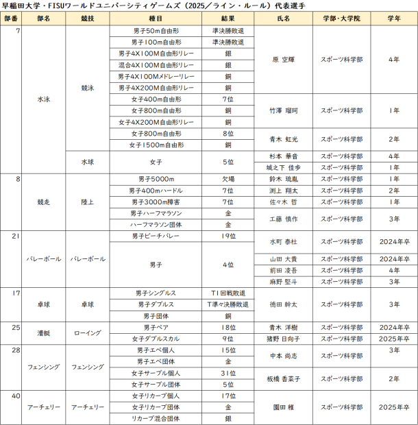 FISUワールドユニバーシティゲームズ(2025/ライン・ルール)が ドイツのライン・ルールにて7月16日から27日にかけて行われ、早稲田大学からは14名の学部生と5名の卒業生が出場し、合計13個のメダルを獲得しました。