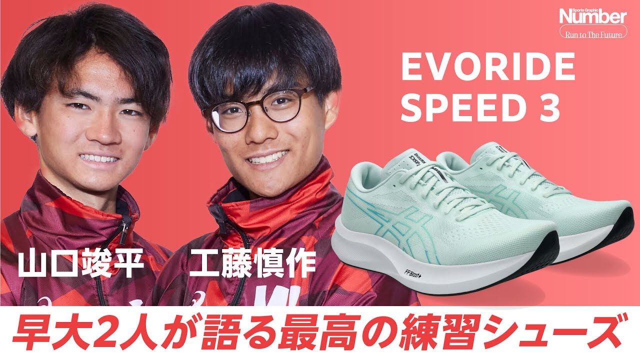 2016 年から続く早稲田大学とアシックスの組織的連携は 2025 年度、フェーズ3(第三期)を迎えました。その連携の象徴的な存在として 2025 年 3 月、早稲田大学競走部がトレーニング強化を図る上で同社へ求めていた新作ランニングシューズ「EVORIDE SPEED 3(エボライドスピード 3)が発表されました。花田勝彦駅伝監督も待ち望んでいたという、画期的なランニングシューズ。練習で愛用している「山の名探偵」こと工藤慎作選手(スポーツ科学部3年)と、1年生ながら箱根駅伝 3 区・区間 3 位の好走を見せた山口竣平選手(スポーツ科学部2年)は、「エボライドスピード 3 と共に結果を残す」と意気込んでいます。