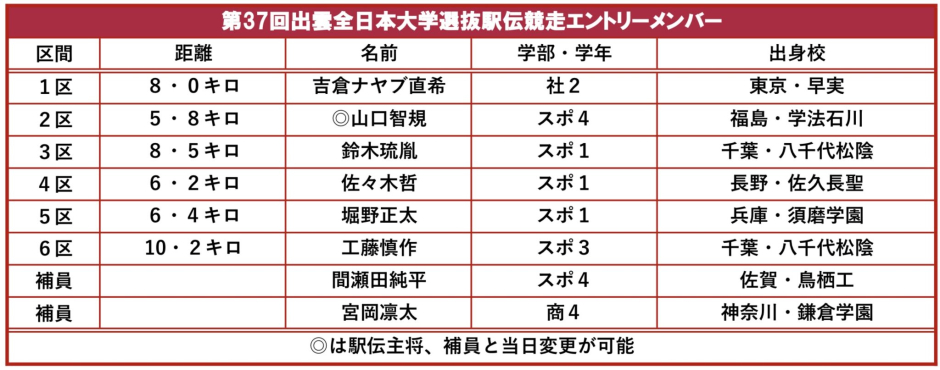 今季は下級生の頃からチームを引っ張っている実力者たちに、全校高等学校駅伝(都大路)の区間記録、日本人最高記録などを持つルーキーたちが合流。最大の目標である「箱根総合優勝」に向けて、最高の面子がそろい踏みした。そのような中、2010年以来の優勝を目指す早大は1年生を3人そろえたフレッシュな布陣でエントリー。経験豊富な山口智規駅伝主将(スポ4=福島・学法石川)と工藤慎作(スポ3=千葉・八千代松陰)で1年生を挟み込む、隙のないメンバー編成となっている。新しい風を追い風に、古豪復活ののろしを上げることができるのか。出雲大社から出雲ドームまでの45・1キロを駆け抜ける選手たちを紹介する。→続き・コメントを読む
