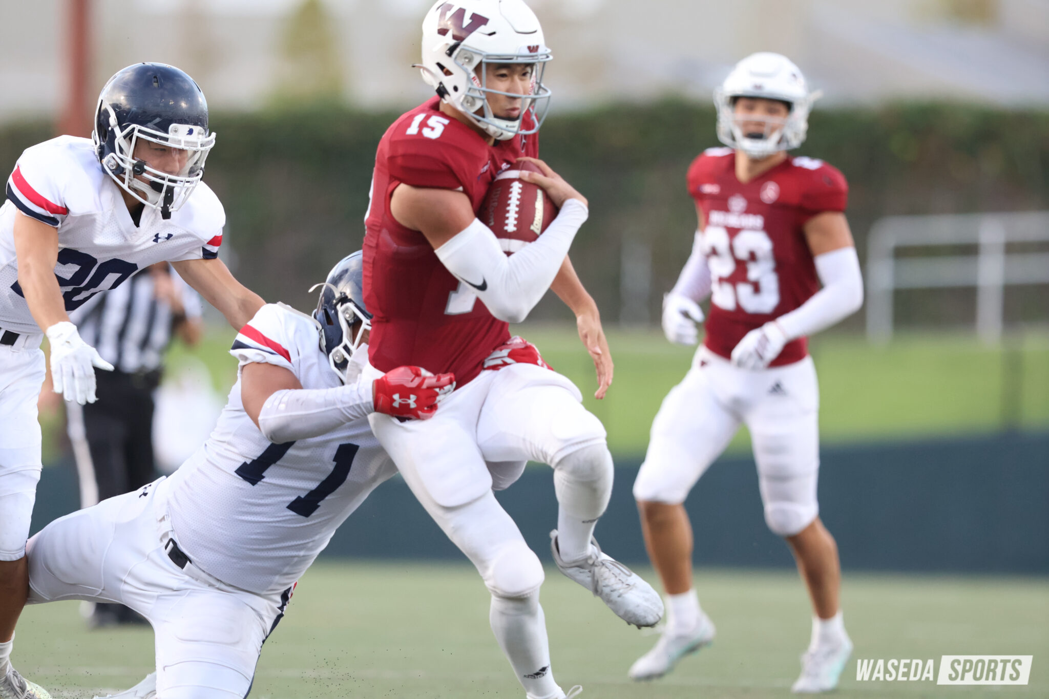 時折強い風が吹くコンディションの中、今シーズン2度目となる早慶戦が行われた。試合は、慶大に先制を許すと、その後も早大はオフェンスがうまくかみ合わず、苦しい時間が続く。1ポゼッション差で迎えた後半、QB船橋怜(政経4=東京・早大学院)のTDでついに流れを引き寄せ、RB安藤慶太郎副将(社4=東京・早大学院)が安定の2TD。辛勝とはなったが、無傷の開幕5連勝となった。→続き・コメントを読む