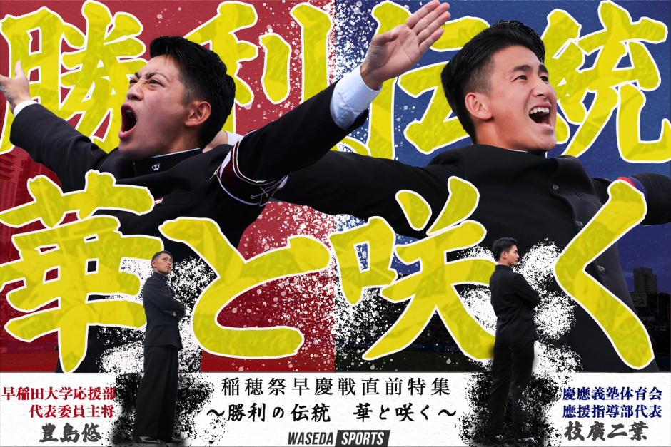 稲穂祭・早慶戦直前特集として歴史・伝統ある両部を率いる早稲田大学応援部・豊島悠代表委員主将兼連盟常任委員(教4=神奈川・桐蔭学園)と、慶應義塾体育会應援指導部・枝廣二葉代表(4年)のお二人に早スポ・ケイスポ合同でお話を伺った。早スポでの早慶主将代表対談は5年ぶりとなる。→続きを読む
