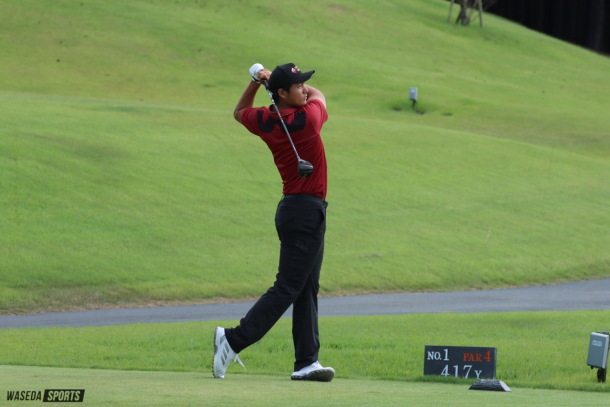 最終日のバックナインで最初のティーショットを放つ中野主将
