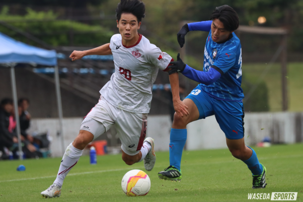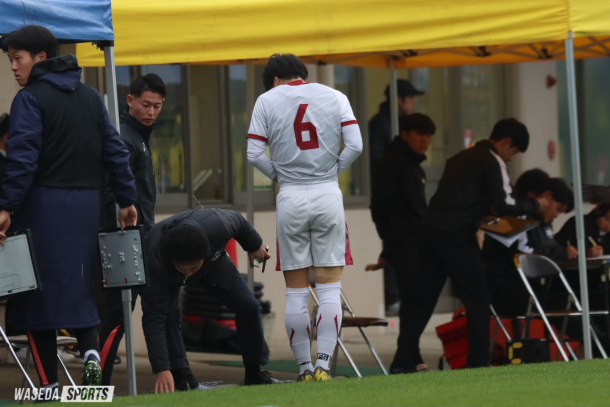 立ち上がり7分にいきなり試合が動く。相手の中盤からの突破に対して適切な対応を取れず先制を許してしまう。早い時間に追い付きたいア式は、16分にMF神田拓人(スポ2=福島・尚志)のロングボールをMF高橋作和(法3=東京・国学院久我山)が受けてチャンスを作るもゴールへは結びつかない。22分にはDF伊藤稜介(スポ2=ジュビロ磐田U18)がミドルシュートでゴールを狙ったが枠を捉えきれず。迎えた34分、相手にコーナーキックをヘディングで合わせられて追加点を与えてしまう。ここで早くも交代を決断した兵藤慎剛監督(平20スポ卒=長崎・国見)。39分にDF西凜誓(社3=名古屋グランパスU18)とMF山市秀翔主将(スポ4=神奈川・桐光学園)を投入して事態の立て直しを図る。その後は山市中心にゴールへ迫ったア式だったが前半のうちに得点は奪えず。前半を2点ビハインドで折り返す。→続き・コメントを読む