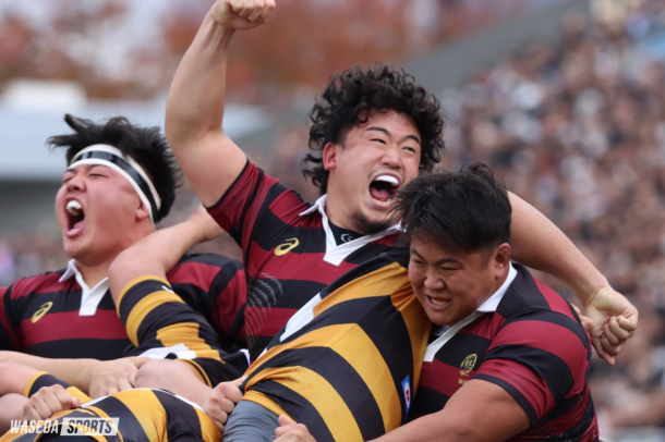 赤と黄、二色の紅葉に彩られた神宮外苑の景色を背に、秩父宮ラグビー場で赤黒と黒黄を身にまとった戦士たちが102回目を迎える伝統の一戦に臨んだ。前節で接戦の末に敗北している者同士、今節は絶対に負けられない。前半から主導権を握る早大は豊富な引き出しから多彩な攻撃を繰り出す。FWがスクラムでプレッシャーをかけ、ボールを有利に支配したかと思えばキックパスを織り交ぜながらBKが慶大のディフェンスを翻弄(ほんろう)。先に2トライを挙げる。対する慶大も突き刺さるディフェンスやSH橋本弾介(慶大)の持ち出しでチャンスを作り反撃し、14-7。しかし勢いの衰えない早大は連続で3トライを奪い、35-7で試合を折り返した。変わって後半、息を吹き返した慶大が19分にはモール、26分には劇的なインターセプトから好機をものにし、35-21と追い上げる。これ以上差を縮められるわけにはいかない早大は途中出場の選手らが躍動し、2本を返すとスコアは49ー21。試合終盤にゴール前まで攻め込まれるも、ディフェンスでプライドを見せた早大がゴールを守り切り、ノーサイド。早慶戦は早大に軍配が上がった。→続き・コメントを読む