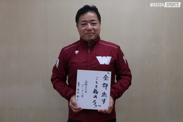 千葉・八千代高出身。1991(平3)年人間科学部卒業。2012年に早大のコーチに就任し、2014年から監督となった。色紙には、「全部出すことを極めろ!!」と今年のスローガンである「異常を極める」に因んだ意気込みを書いていただきました。試合前には試合の動画を見ることが日課とのことでした。