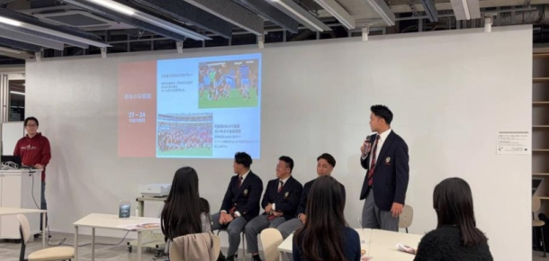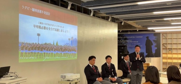 11 月 24 日(月)、 早稲田大学Global Citizenship Center(以下 GCC)のGCC Common Roomにて、関東大学ラグビー対抗戦「早明戦」での勝利と対抗戦の優勝、そしてその先に続く日本一の座を目指す ラグビー蹴球部への応援機運を高めようと「ラグビー蹴球部選手交流会」(競技スポーツセンター学生プロジェクトVIVASEDA主催)が開催されました。ラグビー蹴球部からは、前日の「早慶戦」で見事に勝利した、野中健吾主将、田中勇成副将、栗田文介選手、福島秀法選手、谷口宗太郎主務らが参加。部の紹介をはじめ、普段知ることのできない選手の一日のスケジュールや寮の様子など大変興味深い話ばかりで、熱心に耳を傾ける参加者の顔が多く見られました。