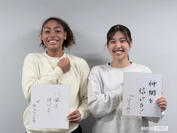 インカレ前対談最終回はF望月綾乃主将(スポ4=東京・実践学園)とF西ファトゥマ七南副将(スポ4=千葉・昭和学院)の早稲田の主将副将コンビ。終始笑いが絶えない頼もしい二人に今シーズン、そして早稲田での四年間を振り返ってもらった。→続きを読む