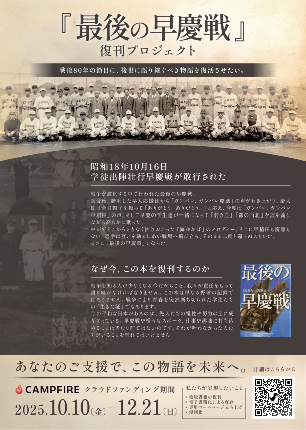 その記録をまとめた書籍『学徒出陣 最後の早慶戦』が、クラウドファンディングを通じて復刊される。発起人は、当時慶大の捕手として出場した松尾俊治氏の孫にあたる中野雄三郎さん(平13慶大卒)。戦後80年、六大学野球連盟100周年を迎える節目の年に、家族三世代で「復刊プロジェクト」と題した保存活動を立ち上げた。→続き・コメントを読む