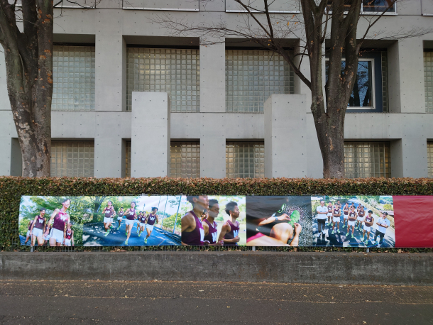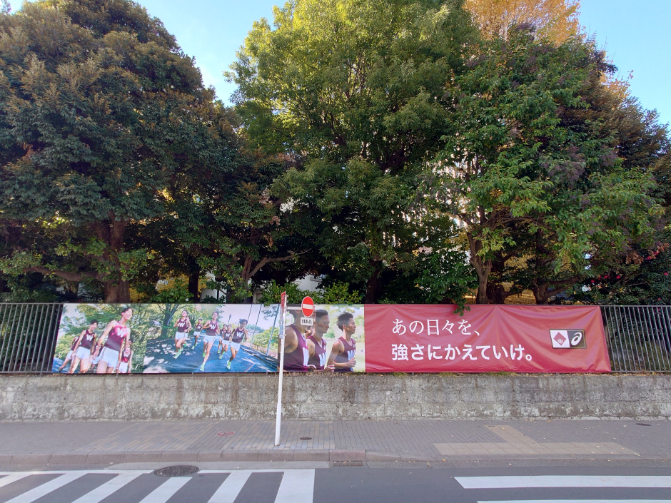 現役の競走部員が出演し、横14メートル×縦1.7メートル(早稲田)と横14メートル×縦0.9メートル(西早稲田)、横6メートル×縦4メートル(所沢)の迫力ある横断幕が、存在感を持って学生たちにメッセージを投げかけています。