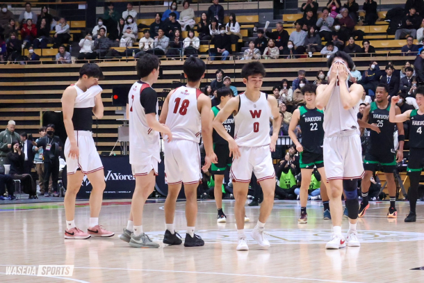 前日の日本経大戦を制し、全日本大学選手権(インカレ)決勝の舞台へ駒を進めた早大。決戦の相手には、昨年のインカレで破れた相手である白鷗大を迎えた。試合はQごとに流れが移り変わる激しい展開。しかし第4Qに相手の3Pシュートが立て続けにヒットし、83-101で敗れた。大会結果は準優勝。関東大学リーグ戦(リーグ戦)から快進撃を続けた早大であったが、冬の頂点にはあと一歩届かなかった。→続き・コメントを読む