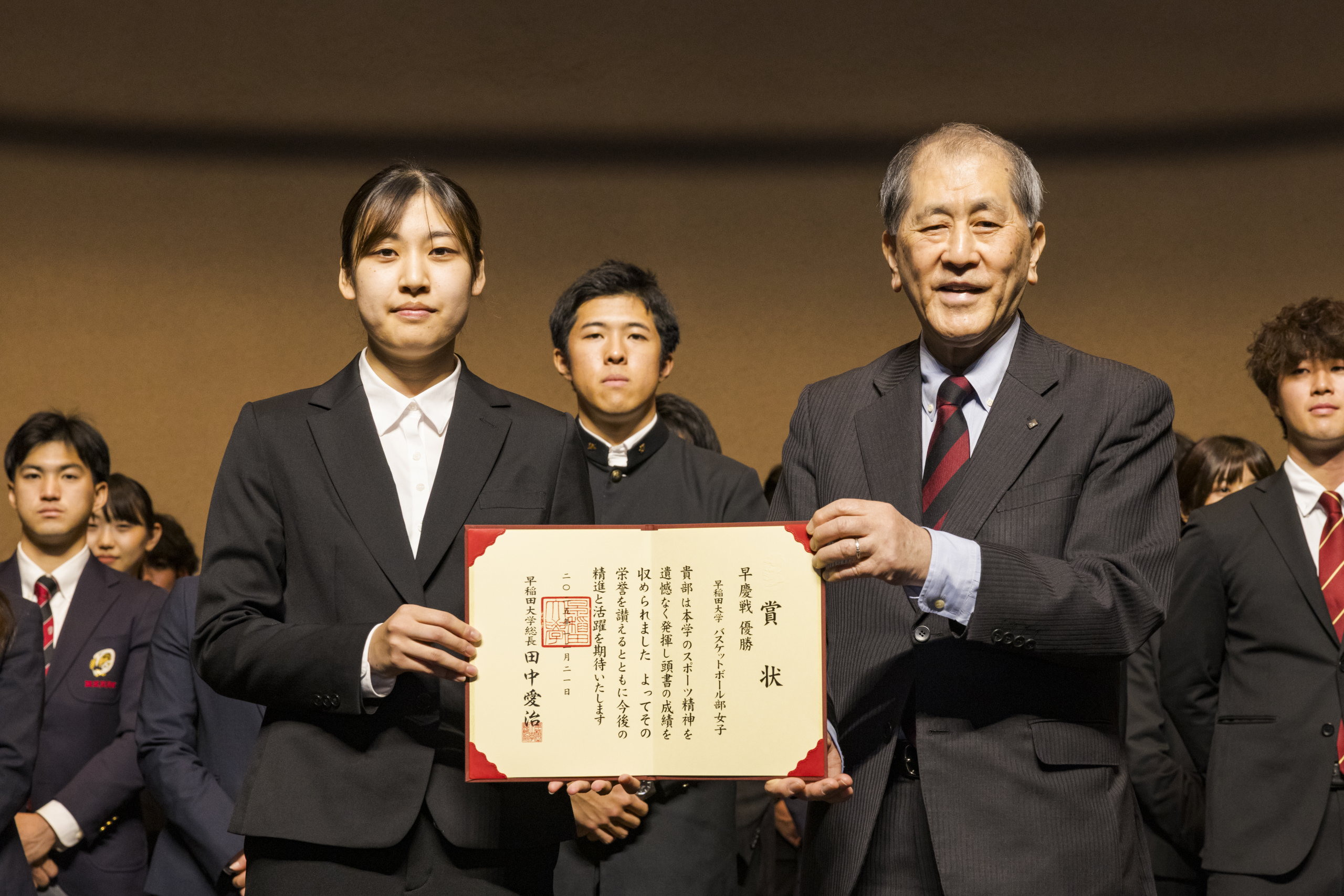 表彰式では、早慶戦優勝部を代表して、バスケットボール部女子・望月綾乃主将(スポーツ科学部 4年)が田中総長から表彰状を授与されました。