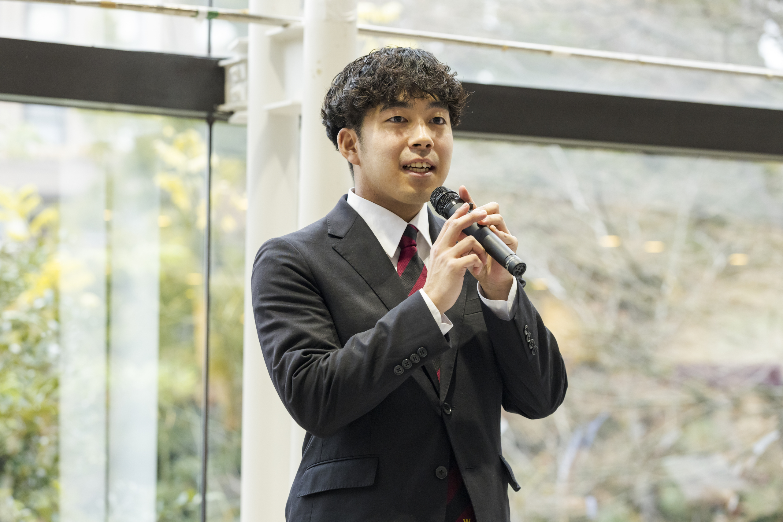 早慶戦優勝部を代表して挨拶をするフェンシング部 竹内主将