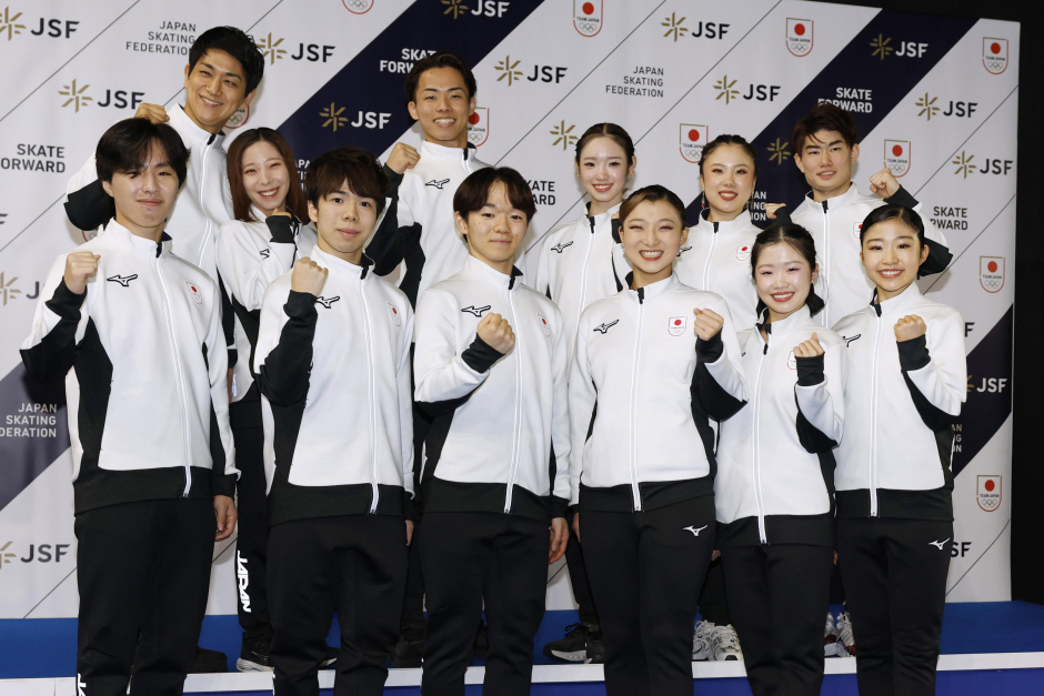 フィギュアスケートのミラノ・コルティナ冬季五輪代表に決まり、ポーズをとる選手たち。前列左から男子の三浦佳生、佐藤駿、鍵山優真、女子の坂本花織、中井亜美、千葉百音、後列左からペアの木原龍一、三浦璃来、森口澄士、長岡柚奈、アイスダンスの吉田唄菜、森田真沙也=12月21日日、東京・国立代々木競技場(共同)