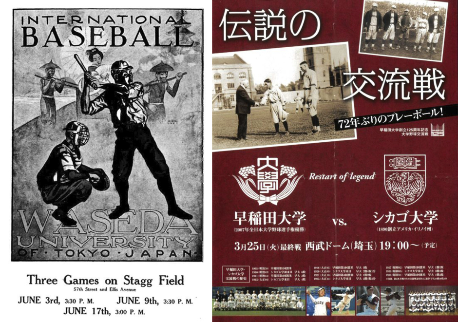 (左)1911年にシカゴ大学野球場「スタッグフィールド」で行われた早稲田大学との試合を伝えるポスター。右は2008年に72年ぶりに日本で行われたシカゴ大学対早稲田大学交流戦のポスター