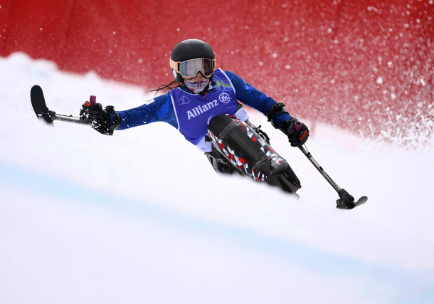 アルペンスキー女子大回転座位の2回目を滑走する村岡選手。銀メダルを獲得した(共同通信)