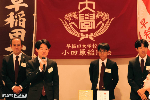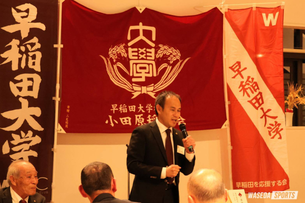 早稲田大学校友会小田原稲門会による「2026年箱根駅伝の健闘を祝う会」が今年も小田原市内で開催された。競走部からは花田勝彦駅伝監督(平6人卒=滋賀・彦根東)、工藤慎作(スポ3=千葉・八千代松陰)、山﨑一吹(スポ3=福島・学法石川)、そして髙尾啓太朗駅伝主務(商3=千葉・佐倉)が出席し、地元の校友らと交流を深めた。→続き・コメントを読む