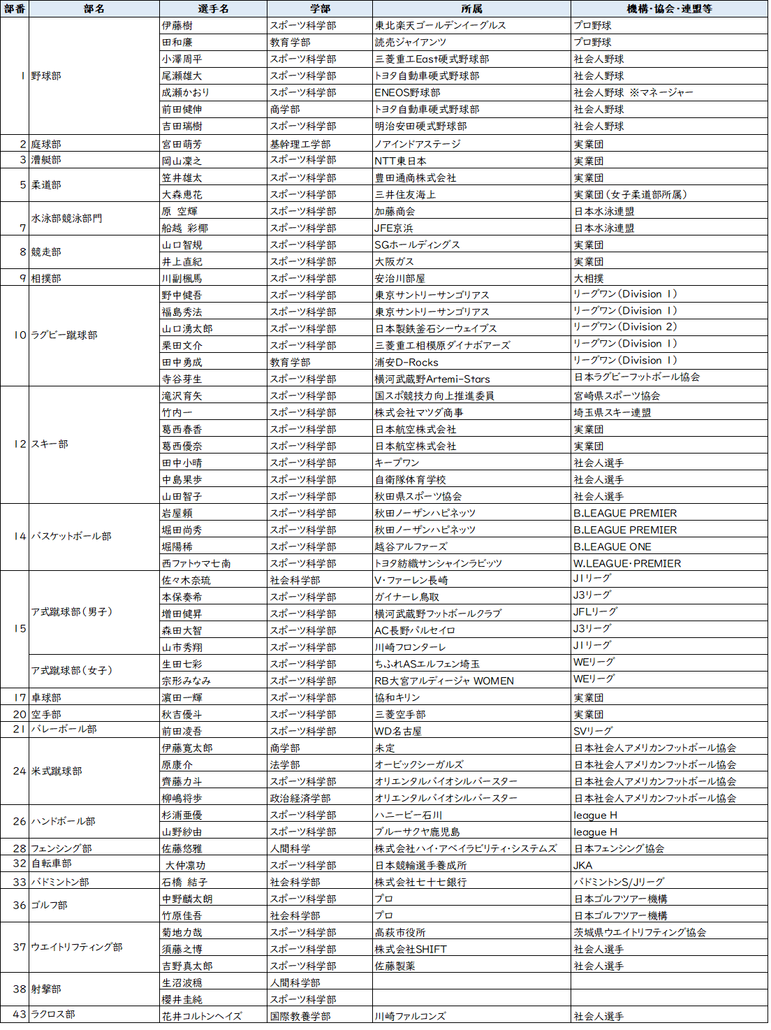 卒業後も競技を継続する学生一覧