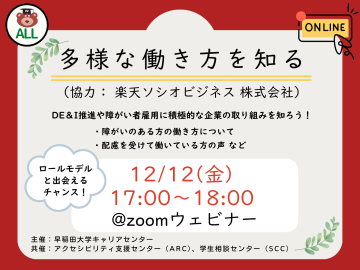 キャリアセンター主催イベントにおいて、文字通訳、手話通訳、場内誘導、座席について配慮をご希望の方は、開催日の3週間前までにご希望の内容をお知らせください。ご相談のうえ、できる限りの対応を検討させていただきます。
