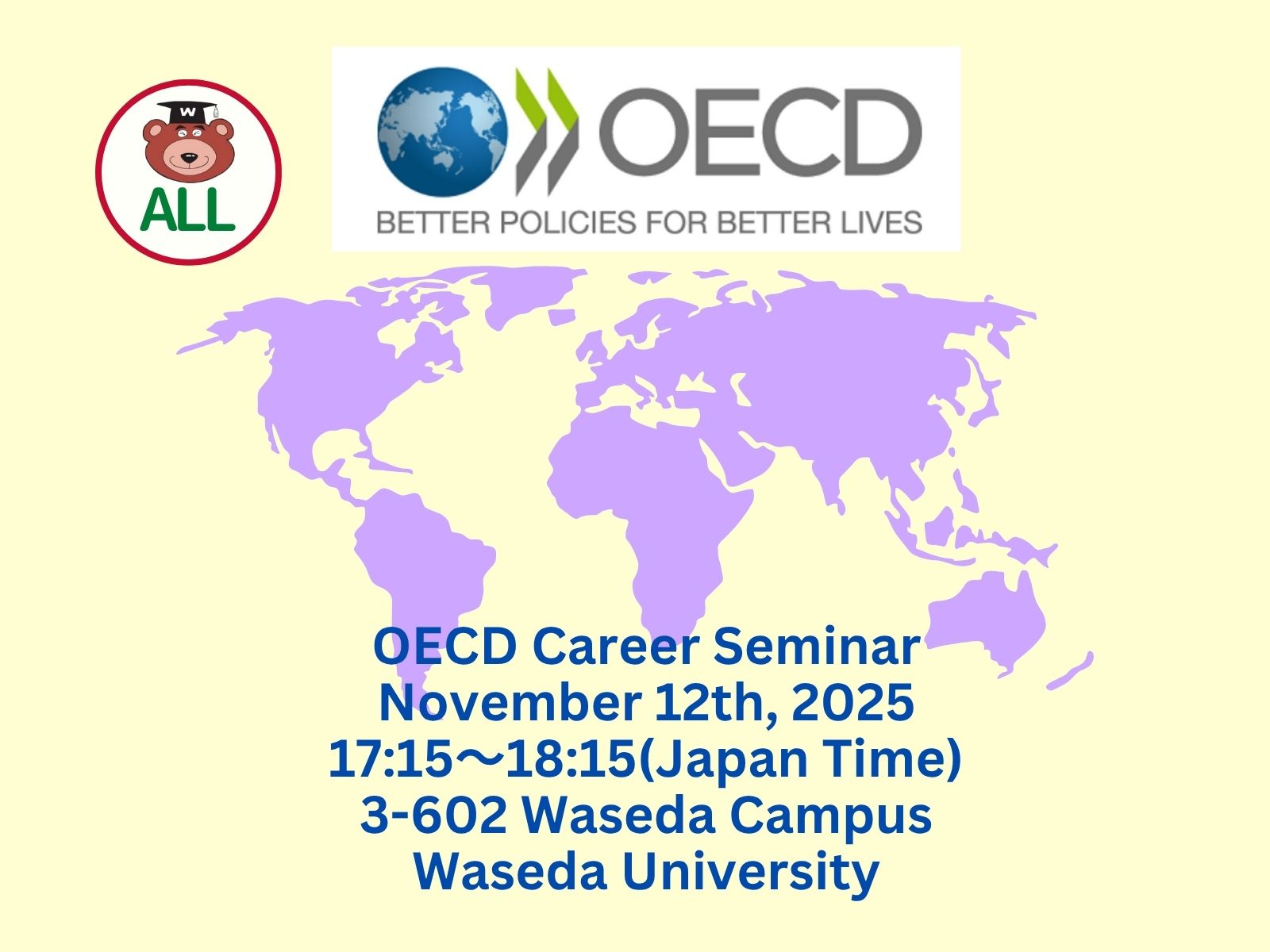 We will hold an OECD Career Seminar with the OECD Paris headquarter in this October. The OECD will make presentation including brief introduction and working at OECD, how to apply for future job positions at OECD and so on. If you are interested in working at an international organization such as OECD, why not come to join?