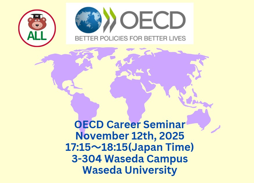 We will hold an OECD Career Seminar with the OECD Paris headquarter in this October. The OECD will make presentation including brief introduction and working at OECD, how to apply for future job positions at OECD and so on. If you are interested in working at an international organization such as OECD, why not come to join?