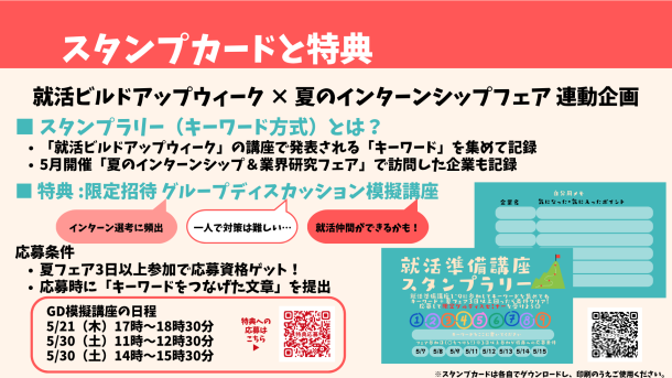 「ビルドアップウィーク」と「夏のインターンシップフェア」の連動企画スタンプラリー開催中!