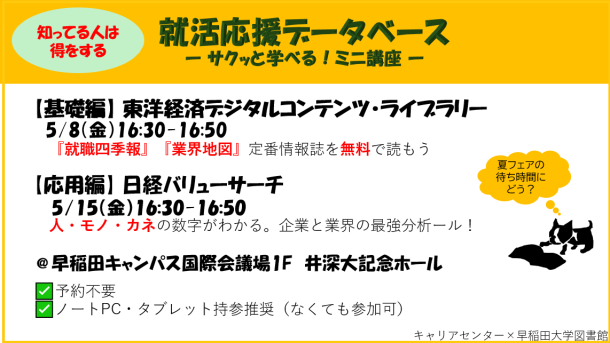 ※5月8日(金)と5月15日(金)16:30~16:50に図書館利用者支援課による「就活応援データベース~サクッと学べる!ミニ講座~」も開催!