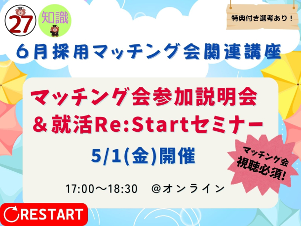⇒<27卒>【5/1】6月採用マッチング説明会&「就活Re:Start!」セミナー