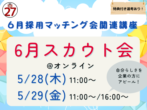 エントリーシートだけでは伝わりづらい自身についてアピールできる「6月スカウト会」をオンラインで開催します。