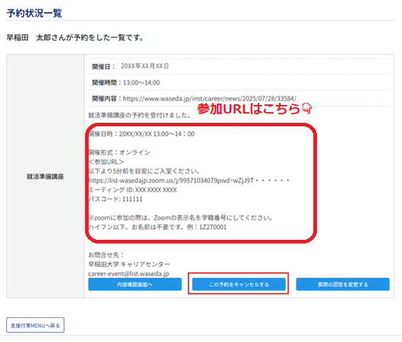 ・イベントをキャンセルする場合は、予約状況一覧の「この予約をキャンセルする」ボタンをクリックしてください