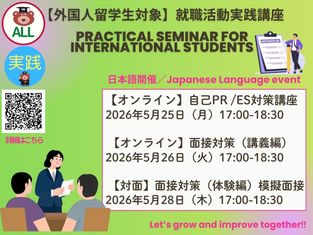 Career Center organizes practical seminars for International Students will be held in 2026(Spring) . By learning the basics about interviewing and getting used to it through hands-on experience and practice, you will be better prepared for the real thing. Why not get through this interview by learning the right knowledge and practicing now? It’s okay if you don’t get it right the first time! Please scroll to the bottom of the page for details on reservation.