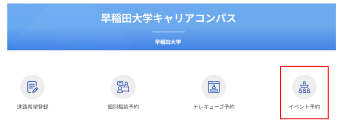 ※MyWasedaログイン → 学生生活 → キャリアコンパス → キャリアイベント・相談予約・求人照会等