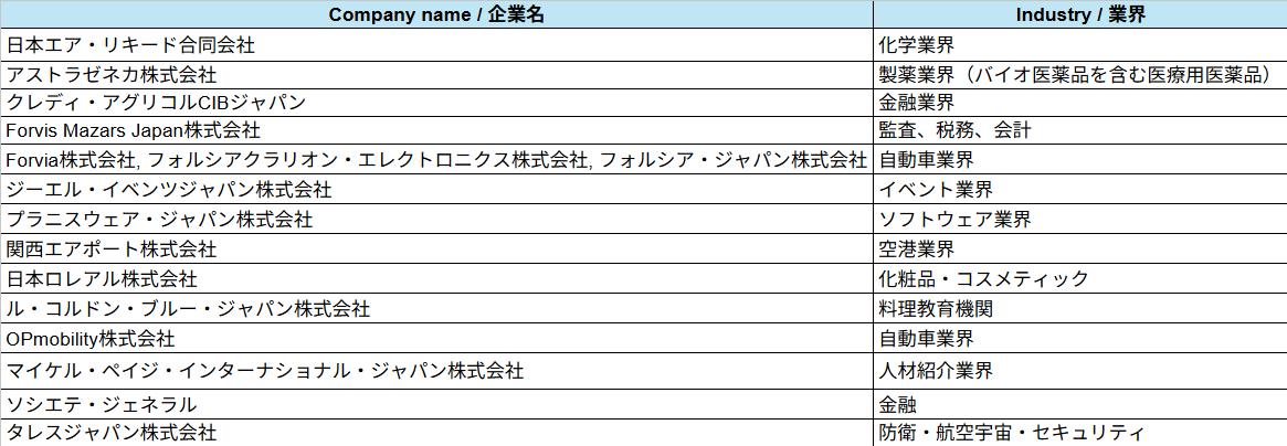 今回のフォーラムでは、14社の有力企業が参加し、皆さまとの出会いを楽しみにしています。フランスや国際的な企業での就職を希望する方、または異なる企業文化に興味がある方は、この機会をぜひご活用ください。