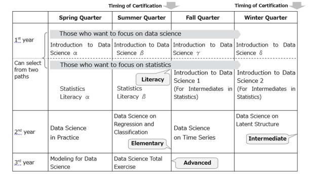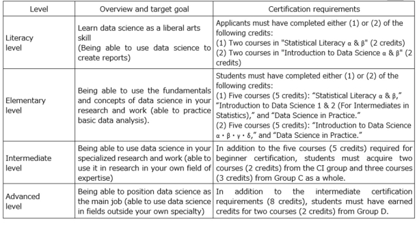 The Certification Program in Data Science comprises four levels that ensure the data science proficiency of students enrolled in university-wide open courses offered by the Global Education Center. By providing concrete goals for each level, students can learn data science according to their interests.