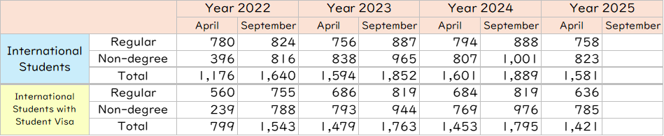 Students who are enrolled at Waseda University as of the survey reference date (including those on a leave of absence or studying abroad) and who hold a nationality other than Japanese. However, students who possess any of the following residency statuses are excluded: “Permanent Resident,” “Special Permanent Resident,” “Long-Term Resident,” “Spouse or Child of Japanese National,” and “Spouse or Child of Permanent Resident.”