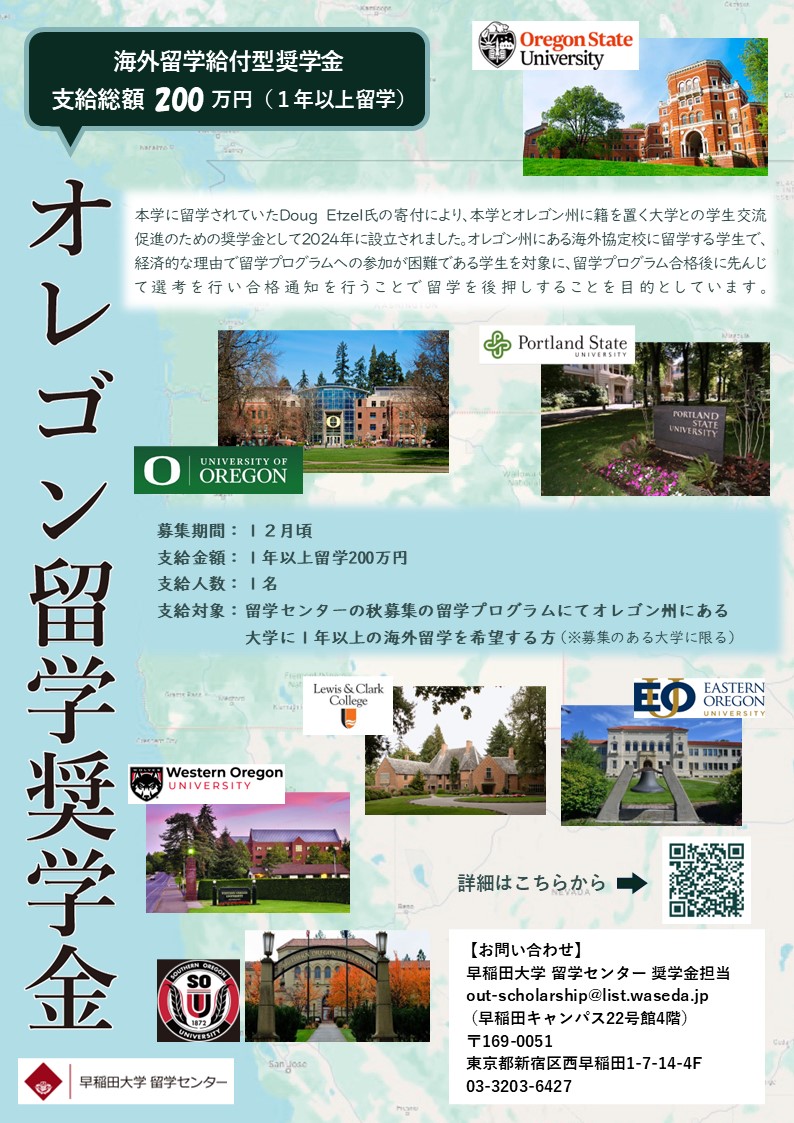 | 対象 | ①留学センターのEX プログラムまたはCSプログラムを通じて、オレゴン州にある大学に1年留学する正規学生 ②日本国籍または永住権(特別永住含む)を有する者 ③経済的困窮度が高い者 ④学業成績が優秀な者 |