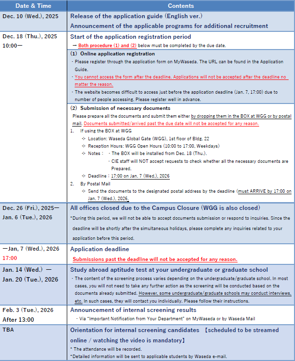 However, those who have already been selected as candidates for programs through the Fall Recruitment for Study Abroad (Deadline: October, 2025) are not eligible to apply.