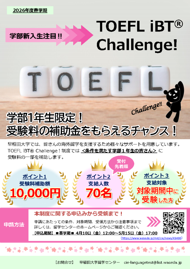 留学に必要不可欠なのが、語学能力試験のスコア!特に英語圏へ留学する方はTOEFL iBT®等の試験を受ける必要があります。TOEFL iBT® Challenge!制度では、条件を満たす学部1年生の皆さんにTOEFL iBT®試験の受験料を補助します。春学期・秋学期にそれぞれ募集を行いますので、是非この機会を活用してください!