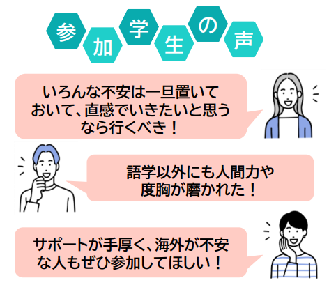 皆さんの語学力、外国語コミュニケーション力の向上や異文化理解の実践的機会として是非活用してください。