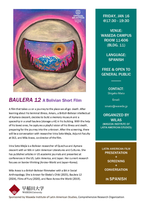 A film that takes us on a journey to the place we all go: death. After learning about his terminal illness, Amaru, a British-Bolivian intellectual of Aymara descent, decides to build a memory museum and a spaceship in a small baulera (storage unit) in his building. With the help of his loved ones, he captures a playful vision of his illness and death, preparing for the journey into the unknown. After the screening, there will be a conversation with researcher Irina Soto-Mejía, Adjunct Faculty at SILS, and Mila Araoz, co-director of the film.