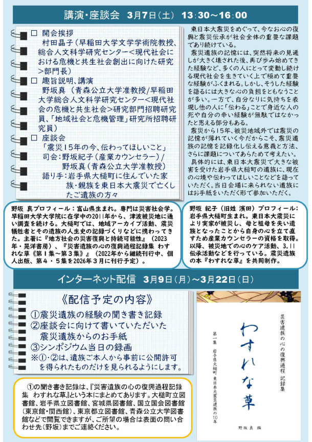 震災から15年、被災地域外では震災の記憶が薄れていく今だからこそ、震災遺族の記憶を記録化し伝える意義と方法、さらに課題についてあらためて考えたい。