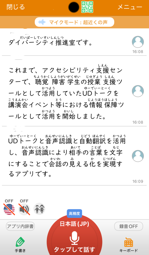 The Diversity Promotion Office (hereinafter referred to as the Promotion Office) has begun operating UD Talk, previously used by the Accessibility Support Center as a classroom support tool for students with hearing impairments, as an information support tool for lectures, events, and similar occasions.UD Talk is an app that leverages speech recognition and automatic translation to visualize conversations by converting spoken words into text. By downloading this app to your smartphone, tablet, or other device, you can display captured audio information as text.