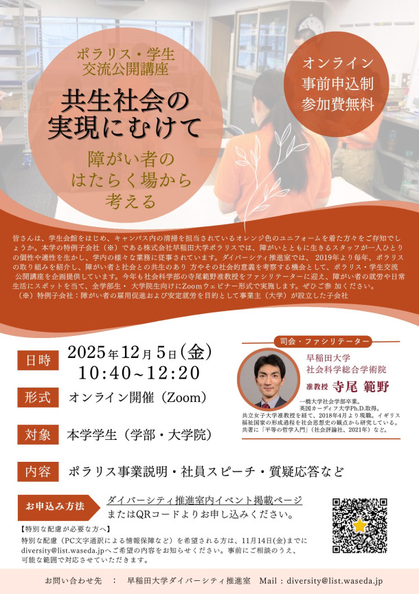 皆さんは、学生会館をはじめ、キャンパス内の清掃を担当されているオレンジ色のユニフォームを着た⽅々をご存知でしょうか。本学の特例⼦会社(※)である株式会社早稲⽥⼤学ポラリスでは、障がいとともに⽣きるスタッフが⼀⼈ひとりの個性や適性を⽣かし、学内の様々な業務に従事されています。ダイバーシティ推進室では、 2019年より毎年、ポラリスの取り組みを紹介し、障がい者と社会との共⽣のあり⽅やその社会的意義を考察する機会として、ポラリス・学⽣交流公開講座を企画提供しています。