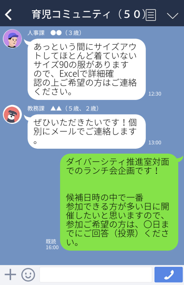 Childcare community activities for full-time and contracted employees will be conducted using LINE Open Chat. On the Open Chat page, staff can freely exchange childcare information and post related issues and solutions. We welcome you to take this opportunity to exchange information with other staff members who have children. The community is a forum suitable for addressing a range of problems such as how to utilize playgrounds during summer heat and how to cope with sudden illnesses in children. In addition to fostering virtual connections, we also host in-person luncheons.