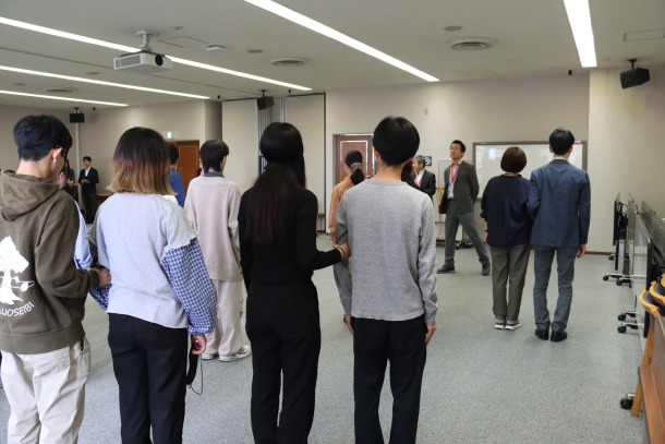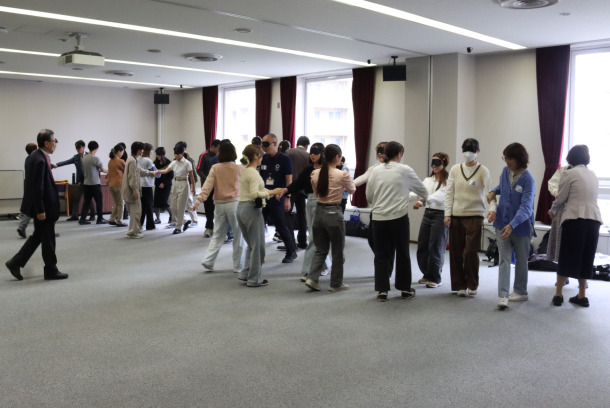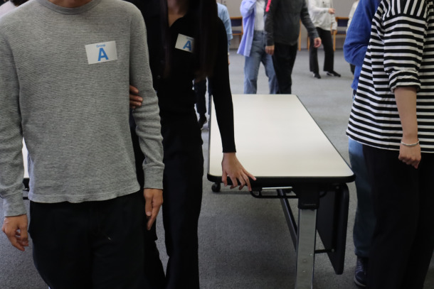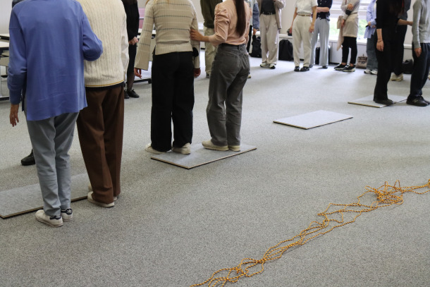 その後、社会福祉法人日本盲人社会福祉協議会東京視覚障害者生活支援センター職員2名より、二人一組でアイマスクを着用しながら、視覚障がい者の歩行誘導の実技指導をいただきました。段差を乗り越える、椅子に安全に座る、障害物の間を通行する、といった実技を通じ、特に視覚障がい者が歩行時に感じる不安と恐怖を実感いただき、この不安と恐怖を取り除くために必要なサポート方法を学びました。