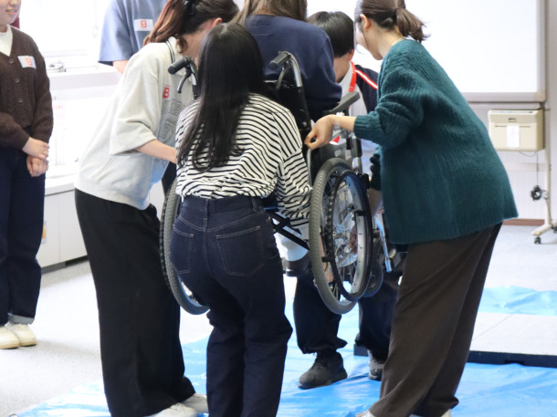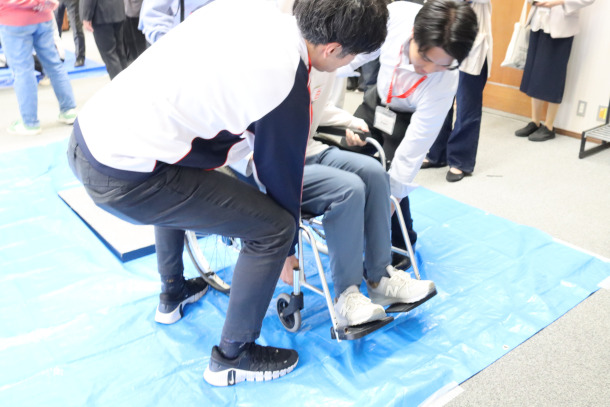 その後、理学療法士4名より4班に分かれ、車椅子に乗車して段差を乗り越える実技指導をいただきました。5cmの段差を乗り越えることが如何に難しいかを実際に体験し、社会には障がい者にとって多くのバリアが存在することを実感することができました。車椅子の構造やどのような改良ができるか、という視点で理学療法士に質問する参加者もいらっしゃり、非常に高い意識をもって取り組んでいただけたことがうかがわされました。